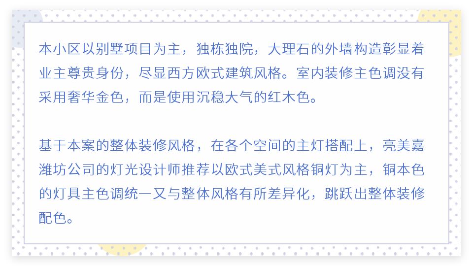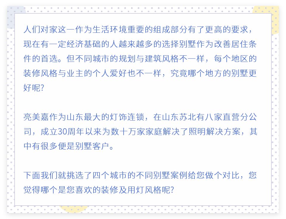 看过了四个不同城市的别墅案例,哪种是您喜欢的风格?其实房子的装修及灯具选择是因人而异,就像我们常说的萝卜青菜各有所爱。没有好与不好一说,只有喜不喜欢与适不适合。